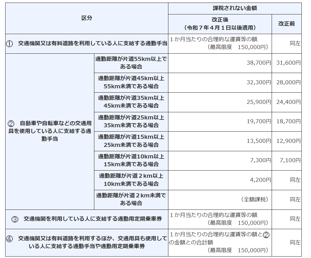 令和7年11月19日に所得税法施行令の一部を改正する政令が公布され、通勤のため自動車などの交通用具を使用している給与所得者に支給する通勤手当の非課税限度額が引き上げられました。この改正は、令和7年11月20日に施行され、令和7年4月1日以後に支払われるべき通勤手当(同日前に支払われるべき通勤手当の差額として追加支給するものを除きます。)について適用されます。このため、改正前に、改正前の非課税限度額を超えた通勤手当を支払っていた場合には、令和7年分の年末調整で対応が必要となることがあります。年末調整の際に通勤手当の金額を見直すことが必要となるため、ご注意ください。(出典 国税庁)